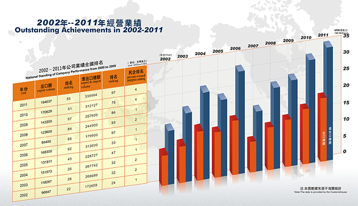 近年來,公司發(fā)展勢頭良好, 2014年公司實(shí)際出口額達(dá)到10.5億美金,排名“2014中國出口200強(qiáng)”第192名,其中民營企業(yè)排名第21名。公司先后獲得 “中國守合同重信用企業(yè)”、 “廣東省先進(jìn)集體”、“廣東省優(yōu)秀民營企業(yè)”、“東莞市50強(qiáng)民營企業(yè)”,“東莞市文明單位”等稱號,公司被東莞市政府授予“東莞市50強(qiáng)民營服務(wù)業(yè)企業(yè)”光榮稱號,公司董事長陳海生被授予“東莞市優(yōu)秀民營企業(yè)家”光榮稱號。